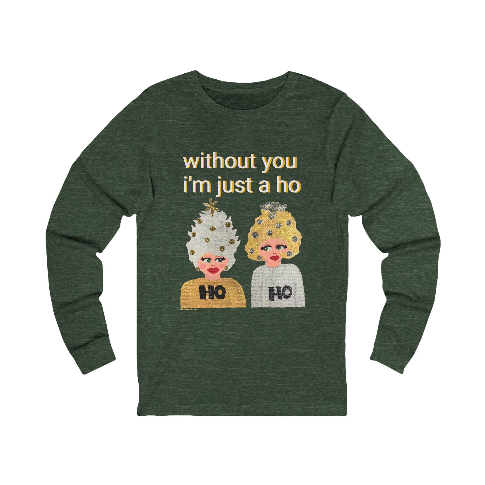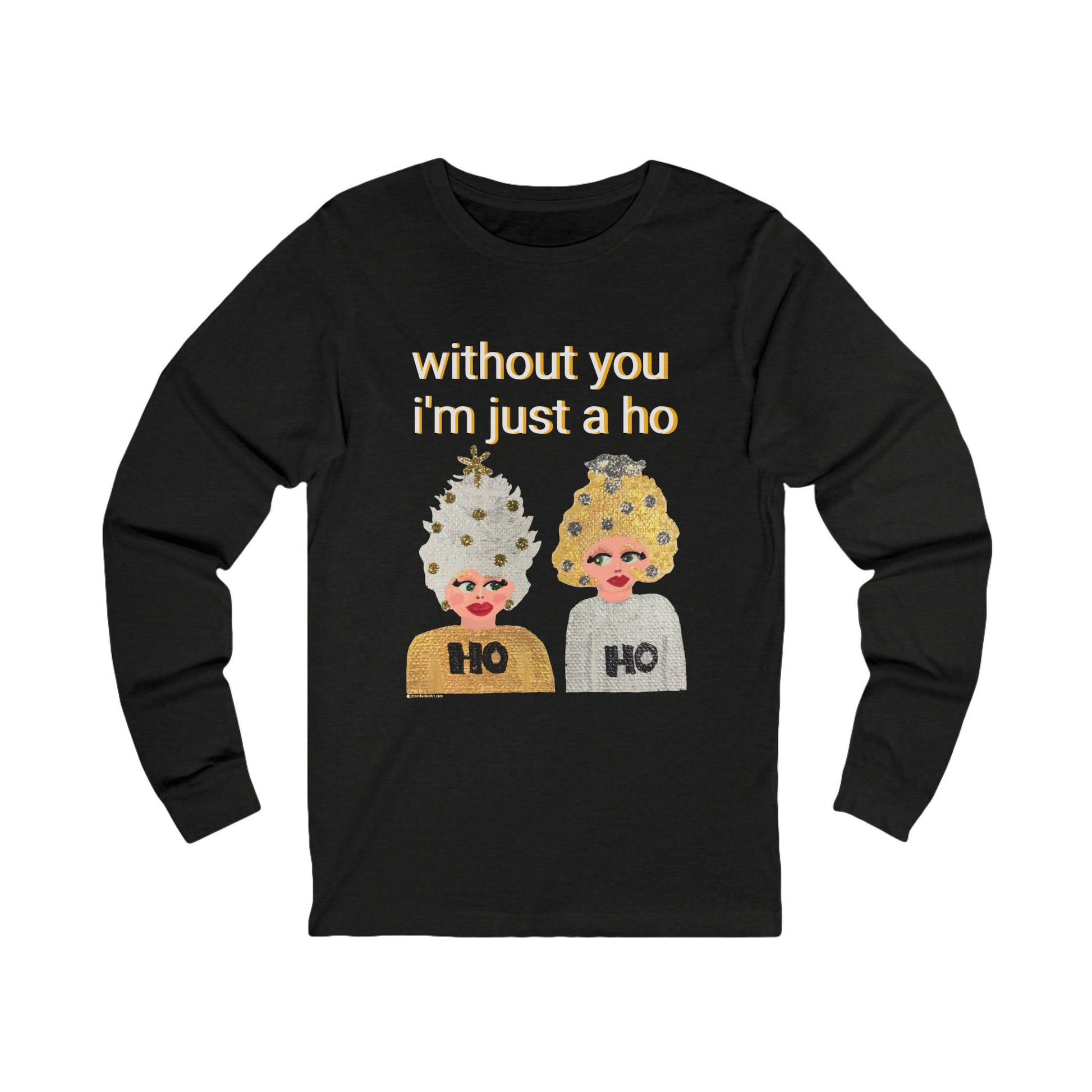 “Without you I’m just a ho.” If you laughed, this shirt’s for you. Our Ho Ho Holiday Hair design slays on this long sleeve tee. Even more hilarious if you and your mom/best pal/gay boyfriend are both wearing one, so you definitely need to buy two.